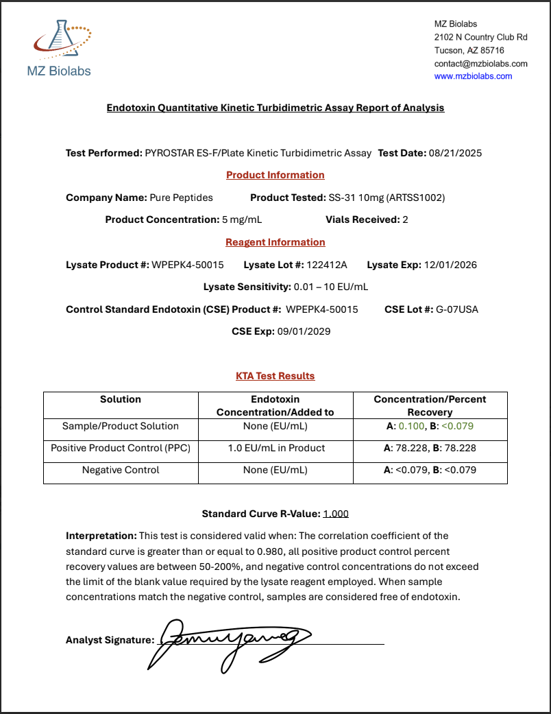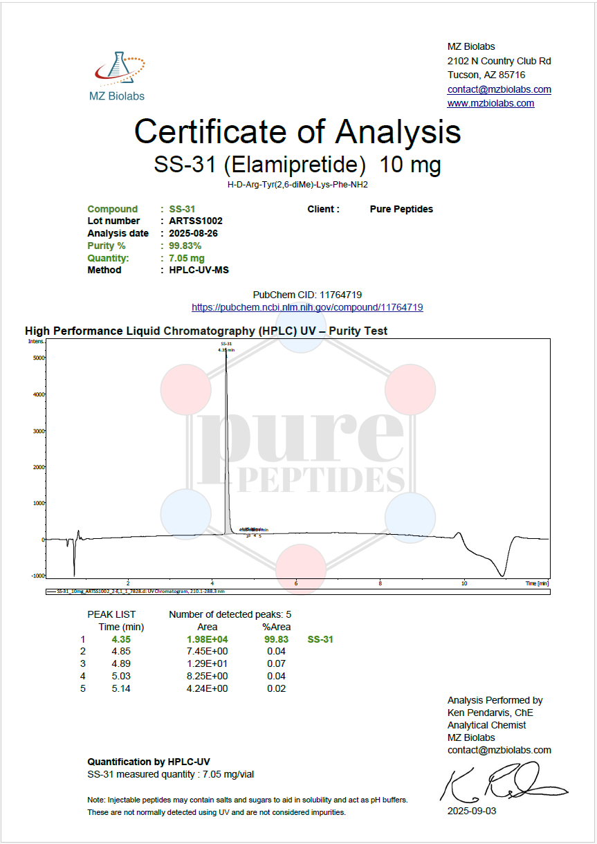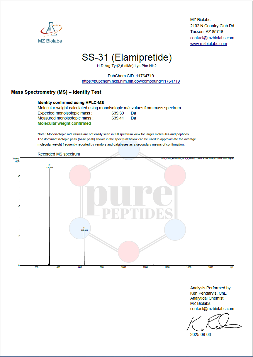 4 chain amino acid mitochondrial anti-oxidant peptide that targets inner cell membrane dysfunction and increases cellular ATP production.